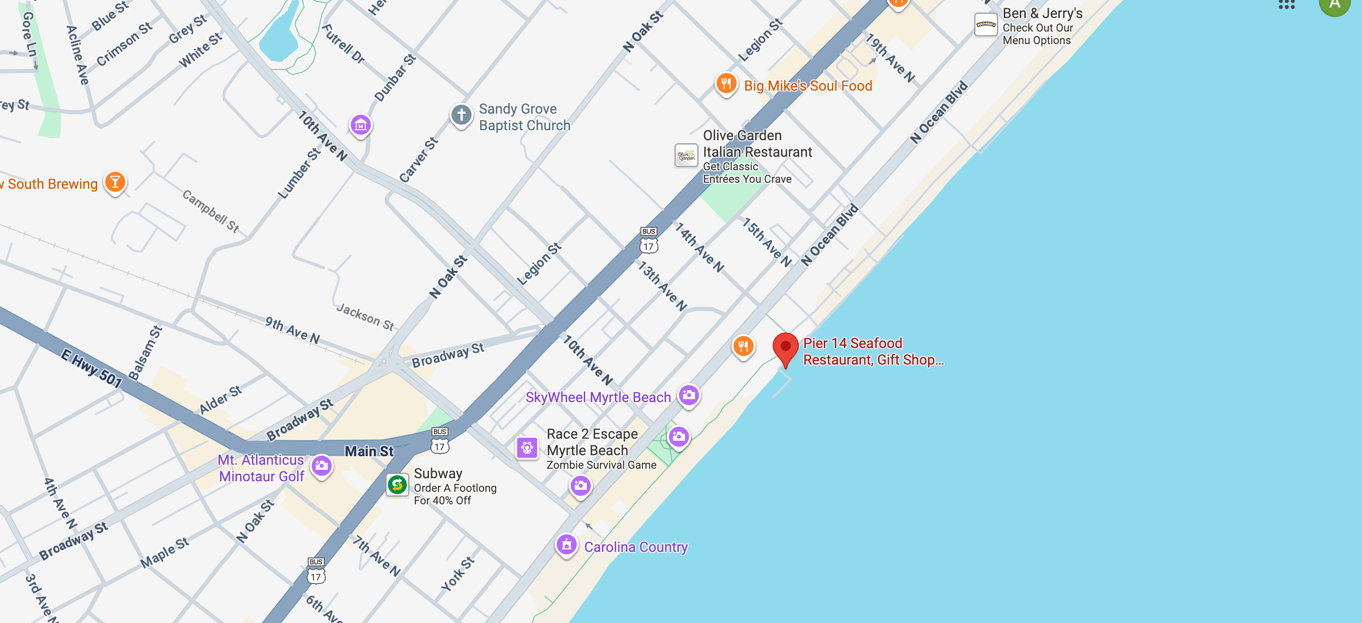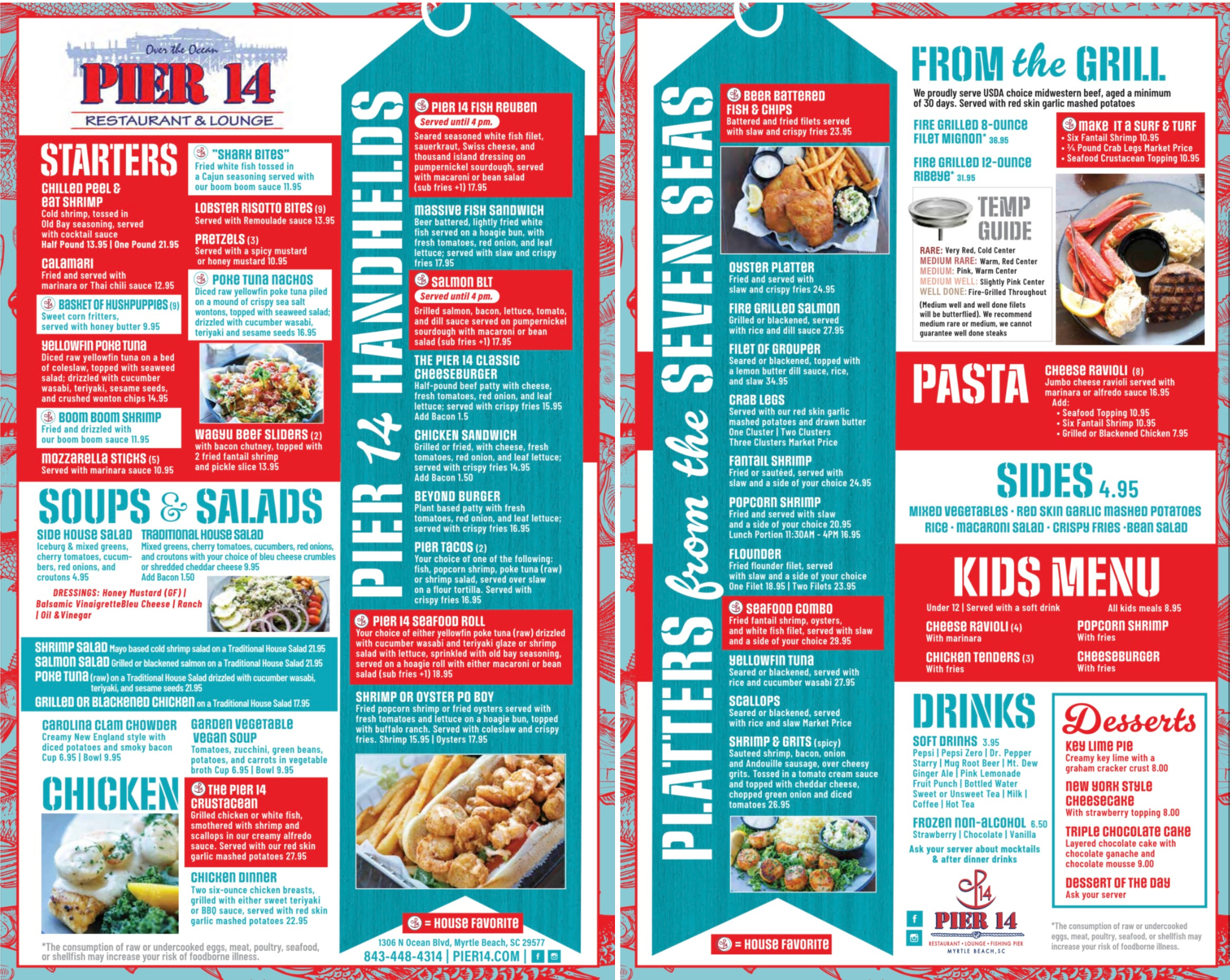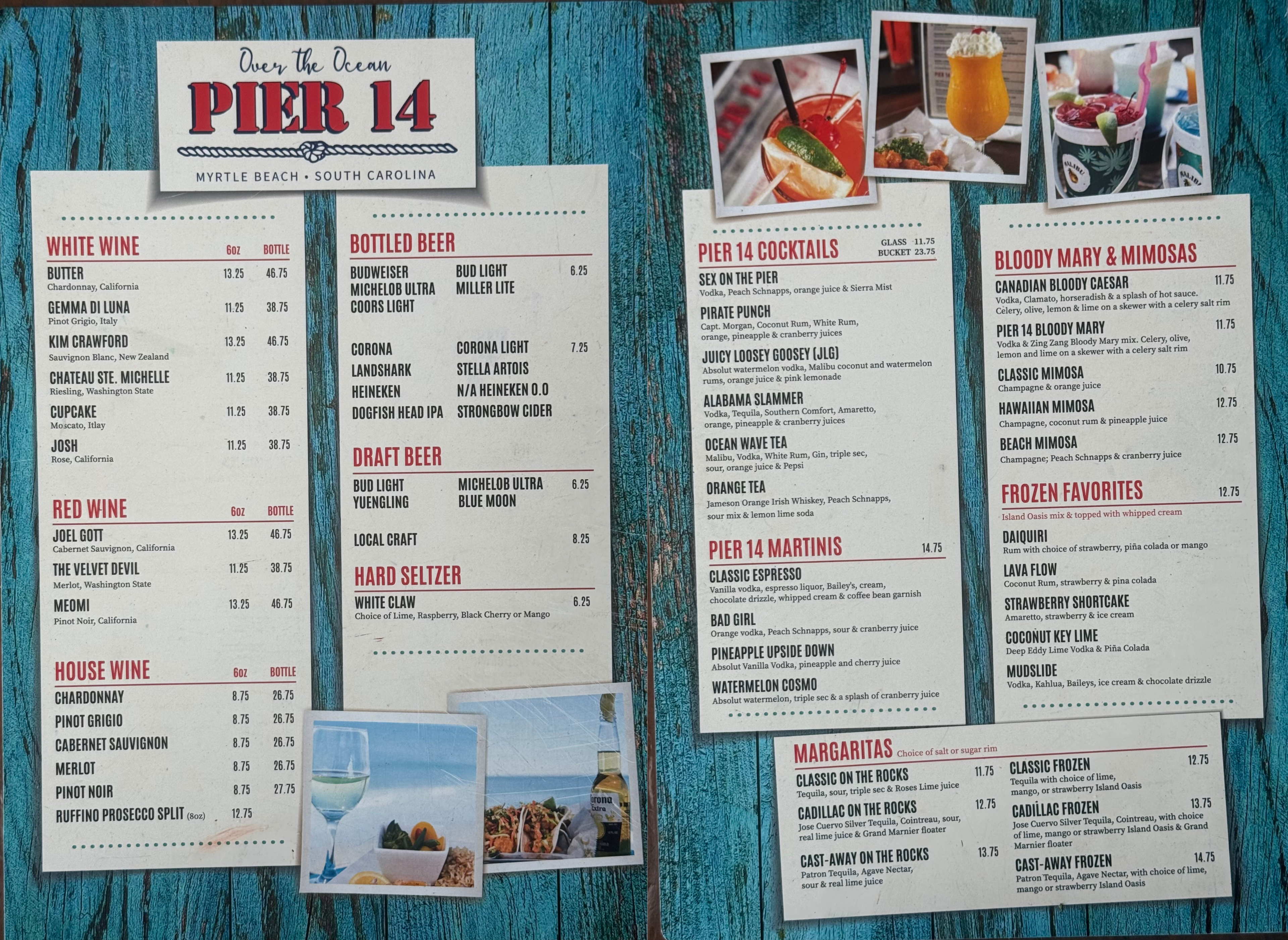Located directly over the Atlantic Ocean, Pier 14 has been a Myrtle Beach landmark for decades, blending breathtaking waterfront views with fresh, flavorful coastal cuisine. From locally caught seafood and hand-cut steaks to signature cocktails enjoyed over the waves, every visit is a taste of the Carolina coast. Whether you’re joining us for a laid-back lunch, a romantic sunset dinner, or drinks at the bar, Pier 14 delivers the perfect combination of ocean breeze, friendly service, and unforgettable flavors.